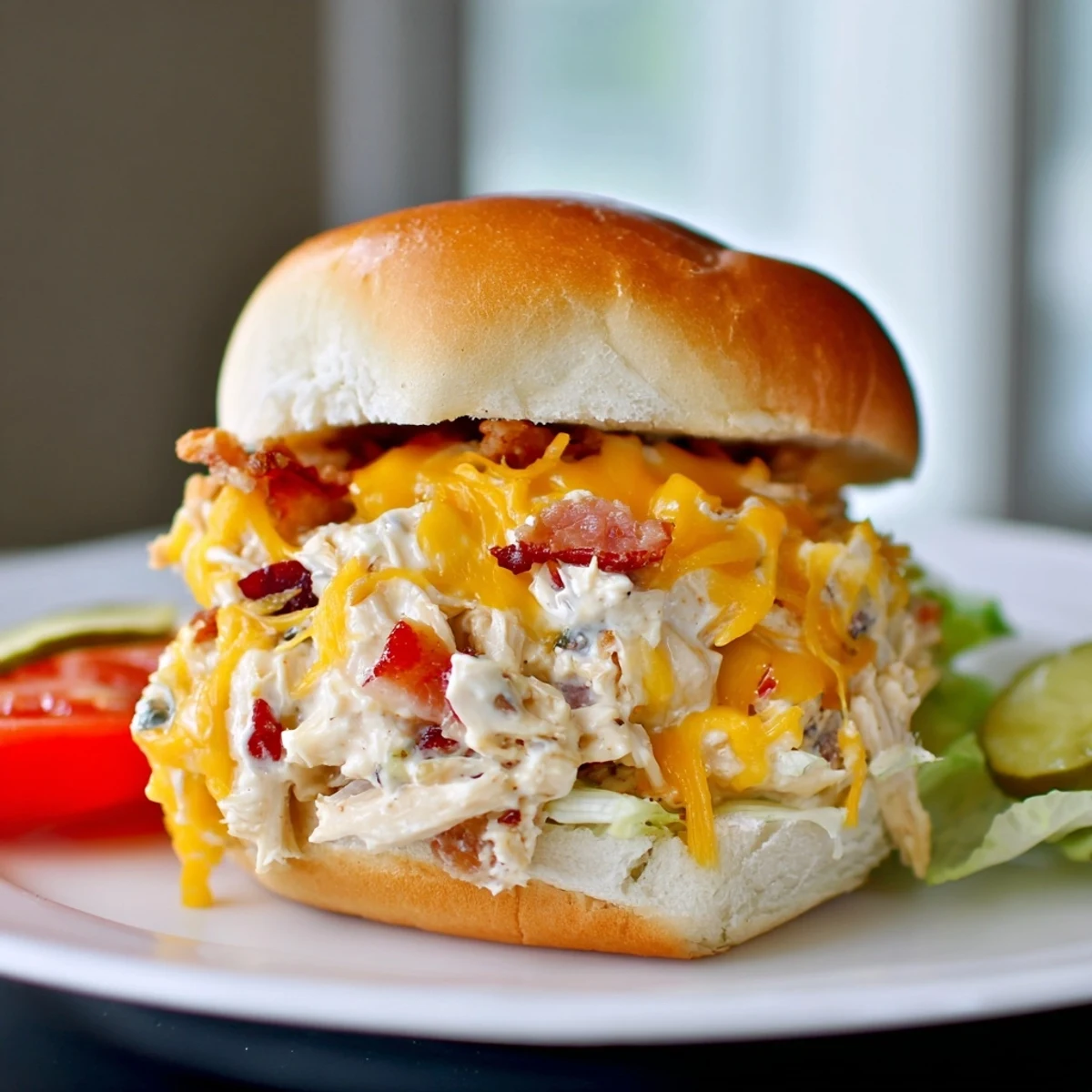Shredded chicken is blended with softened cream cheese, cheddar, ranch seasoning and a splash of milk, then folded with crumbled bacon and baked until hot and bubbly. Spoon the warm mixture onto buns and finish with extra bacon, pickles, lettuce or tomato if desired. Ready in about 40 minutes and yields six hearty sandwiches — ideal for casual meals or feeding a crowd.