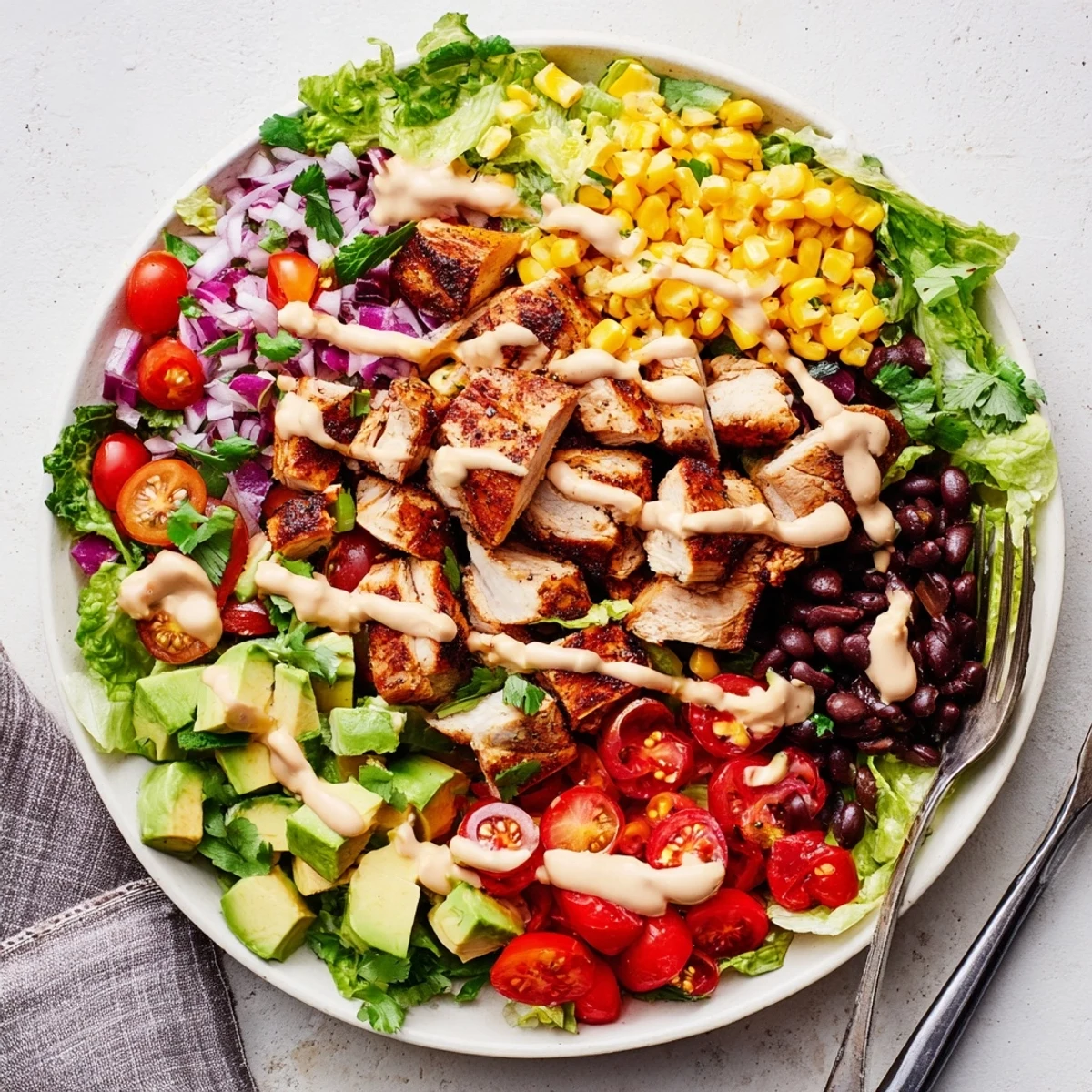 This vibrant chopped salad brings together smoky grilled BBQ chicken with fresh, crisp vegetables for a protein-packed meal that satisfies without weighing you down. The combination of romaine lettuce, cherry tomatoes, black beans, sweet corn, bell peppers, and creamy avocado creates layers of texture and flavor, while the tangy homemade dressing ties everything together beautifully.