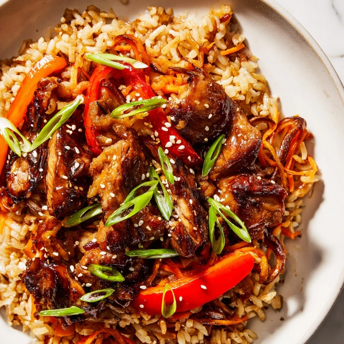 This satisfying one-pan meal brings together tender chicken pieces marinated in a sweet and savory Korean BBQ sauce, nestled with fluffy rice and colorful vegetables. The chicken thighs soak up the bold flavors of bulgogi sauce, soy, sesame oil, garlic, and ginger, while cooking alongside bell peppers, carrots, and onions. As everything simmers together, the rice absorbs all those delicious juices, creating layers of flavor in every bite. Ready in under an hour, this skillet dinner is perfect for busy weeknights when you want something hearty and flavorful without the cleanup.